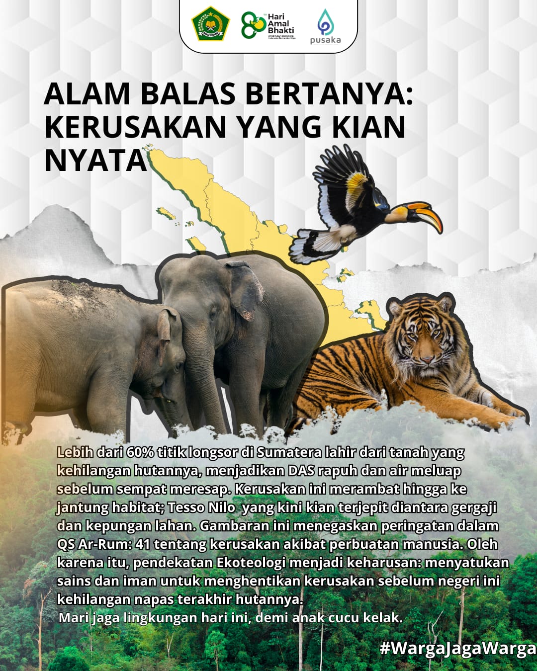 "“Ketika Alam Balas Bertanya: Kerusakan yang Kian Nyata” “Banjir dan longsor di Sumatera bukan sekadar bencana musiman ini alarm keras dari alam yang mulai kehilangan kesabarannya. Lereng runtuh, sungai meluap, hutan menghilang. Semua dalam ritme yang terlalu cepat untuk disebut ‘kebetulan alamiah’. Geologi Sumatera memang liar, tapi kerusakan terbesar bukan datang dari patahan… melainkan dari tangan manusia. Enam puluh persen titik longsor ternyata berada di area yang hutannya telah dibabat. Tanpa akar, tanah kehilangan penopang; tanpa hutan, air kehilangan rumahnya. Al-Qur’an sudah mengisyaratkan, telah tampak kerusakan di darat dan laut karena ulah manusia. Ayat itu bukan ancaman itu cermin. Dan pantulan cermin hari ini membuat kita sulit berpaling. Tesso Nilo runtuh sedikit demi sedikit. Satwa kehilangan habitat. Sungai kehilangan kejernihan. Dan anak cucu kita mungkin hanya akan melihat hutan lewat arsip, bukan kenyataan. Inilah saatnya bertanya: kita mau menunggu bencana berikutnya atau mulai merawat bumi, sebelum ia benar-benar pergi? Ekoteologi mengajak kita kembali sadar: menjaga alam adalah ibadah. Dan gerakan warga jaga warga adalah benteng terakhir agar rumah kita tidak hilang selamanya.”"