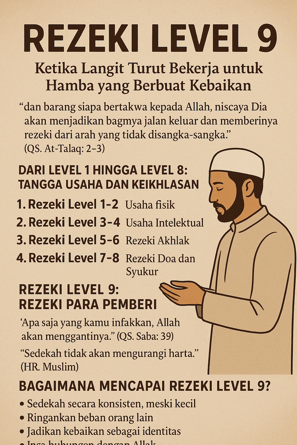"Rezeki Level 9 sejatinya adalah keadaan di mana seseorang sadar bahwa hidup bukan tentang “apa yang kita dapat”, tetapi apa yang kita berikan, dan apa yang kembali kepada kita karena itu. Ini adalah rezeki yang membuat hati tenang. Rezeki yang membuat langkah ringan. Rezeki yang membuat kita lebih dekat kepada Allah."