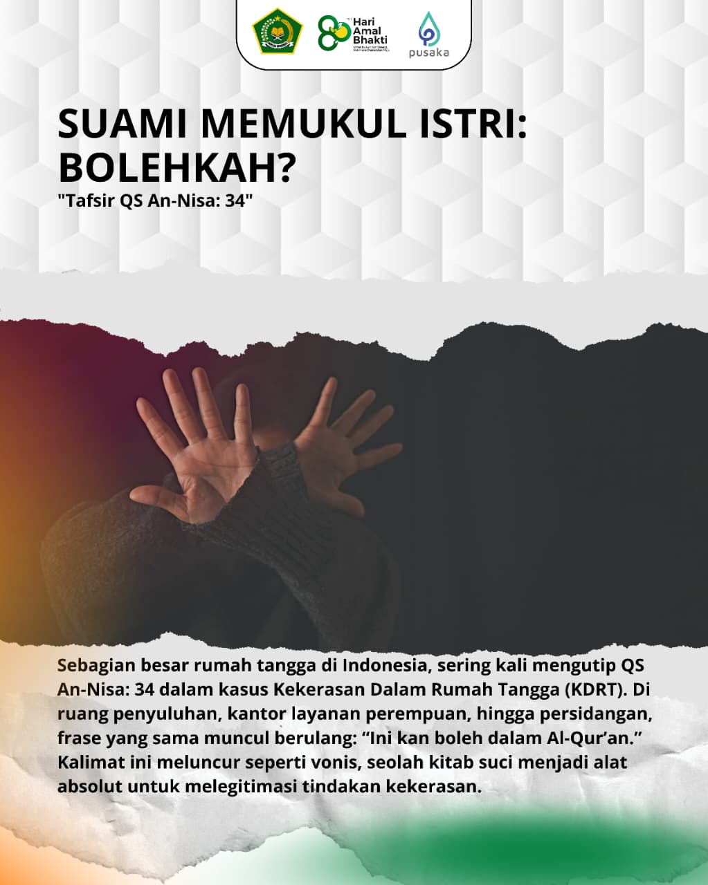 "“QS An-Nisa ayat 34 kerap dijadikan tameng dalam kasus Kekerasan Dalam Rumah Tangga. Di ruang penyuluhan hingga persidangan, kalimat yang sama terus diulang: ‘Ini kan boleh dalam Al-Qur’an.’ Kalimat itu terdengar mutlak—seolah kitab suci dapat dipakai untuk membenarkan kekerasan. Padahal, itu adalah jalan pintas teologis yang bertentangan dengan ruh Islam. Jika tafsir ditelusuri, klaim itu runtuh. Al-Thabari, Ibnu Katsir, dan Jalalain membatasi makna dharaba sebagai pukulan yang tidak menyakitkan—bahkan lebih tepat dimaknai sebagai menepuk, bukan memukul. Mufasir modern seperti Rasyid Ridha menegaskan: ini soal pendidikan, bukan agresi. Wahbah al-Zuhaili bahkan menyimbolkannya dengan siwak—kayu kecil, tiga ketukan. Bukan kekerasan. Dalam bahasa Arab, dharaba juga berarti mengambil jarak. Memberi jeda. Menenangkan konflik. Dan Nabi sendiri tak pernah memukul perempuan. Maka jelas: QS An-Nisa 34 bukan izin kekerasan. Yang layak dilawan bukan pasangan, melainkan ego dan amarah yang membutakan.”"