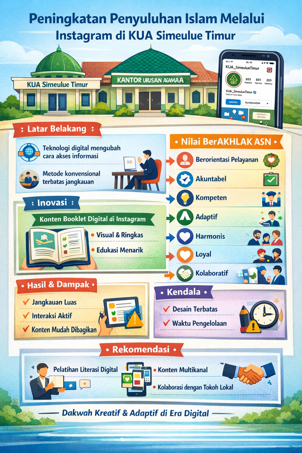 Penyuluhan agama Islam melalui media sosial Instagram dengan booklet digital merupakan inovasi yang relevan dan efektif dalam meningkatkan kualitas layanan keagamaan di KUA Kecamatan Simeulue Timur. Dengan penerapan nilai-nilai berAKHLAK, kegiatan ini tidak hanya berdampak pada peningkatan pemahaman keagamaan masyarakat, tetapi juga memperkuat peran KUA sebagai institusi pelayanan publik yang adaptif dan profesional di era digital.