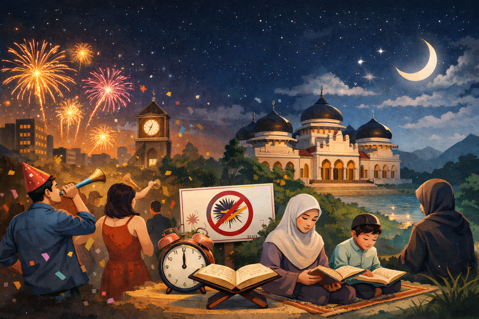 "Ketika jarum jam mendekati tengah malam dan langit di banyak kota bersiap dihiasi kembang api, Banda Aceh justru tenggelam dalam keheningan yang sering memancing tanda tanya: mengapa tidak ikut merayakan tahun baru? Di tengah anggapan bahwa sunyi identik dengan keterbatasan, Aceh menghadirkan pilihan yang berbeda, bukan menolak kegembiraan, tetapi mengajukan makna. Di balik larangan perayaan malam tahun baru tersimpan pesan tentang identitas, disiplin, dan ajakan untuk berhenti sejenak, bercermin, lalu memperbaiki arah hidup. Dari sini, malam tanpa petasan justru menjadi pintu masuk untuk membahas hal yang lebih mendasar. Bagaimana Aceh memaknai pergantian tahun?"